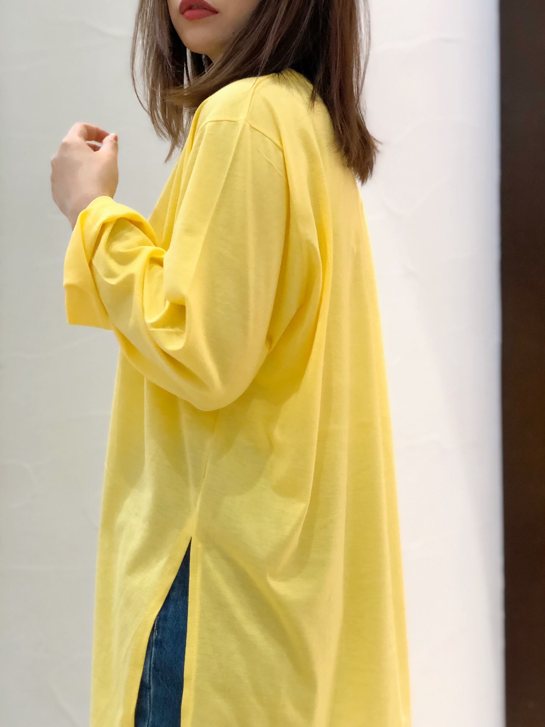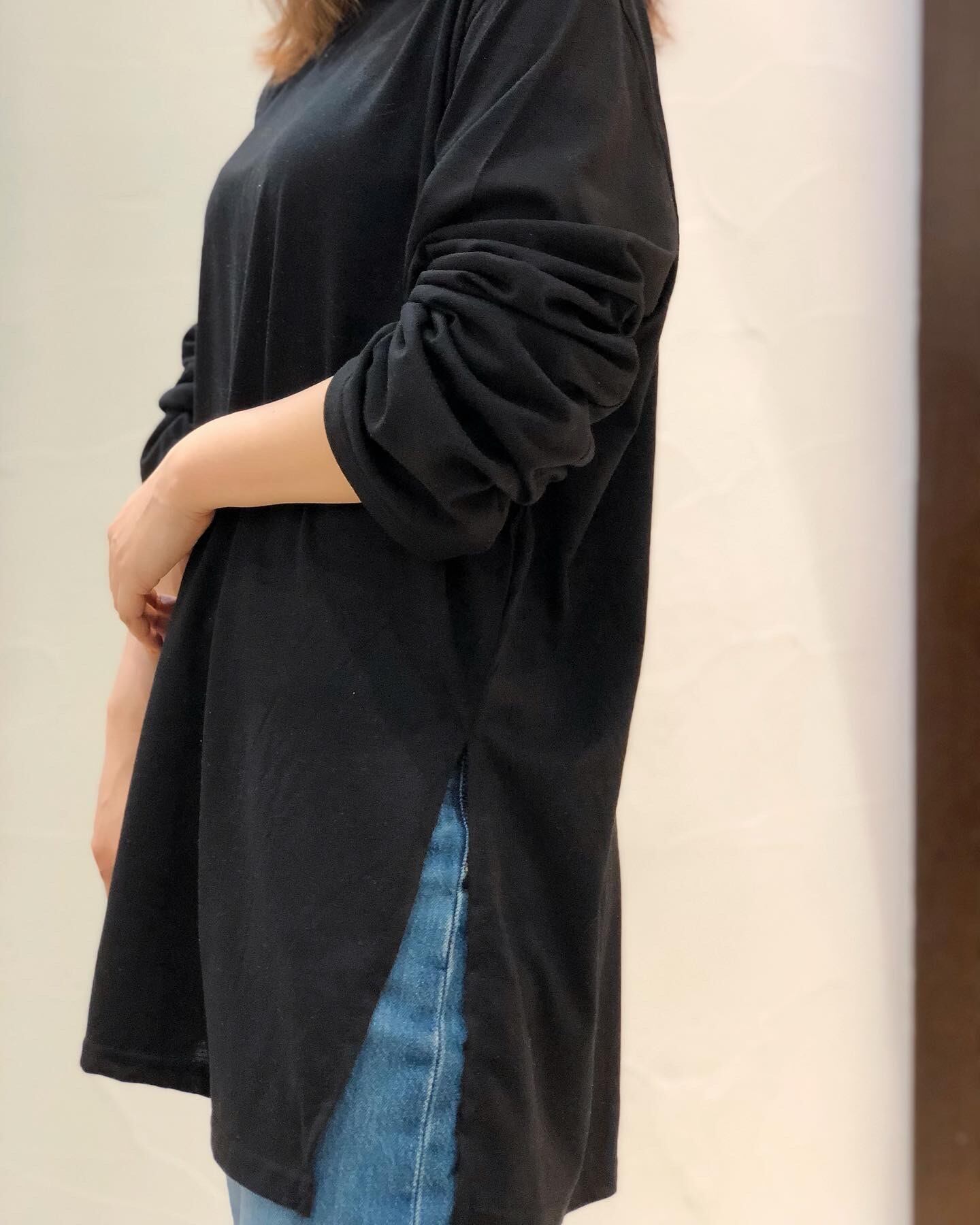 サイドにロングスリットが入ったロングTシャツ。さらっとした肌触りで、デイリー使いしやすい一枚です。