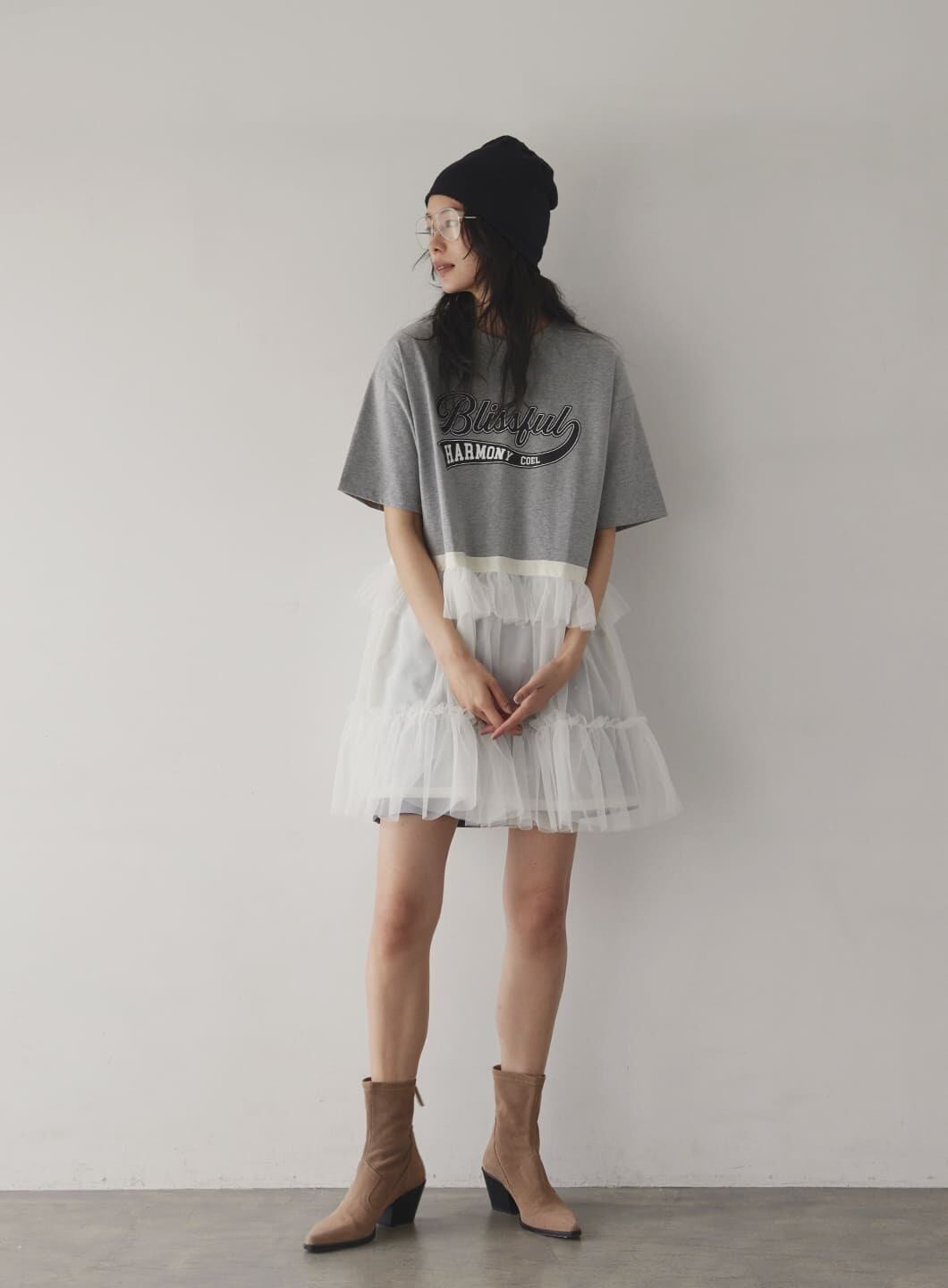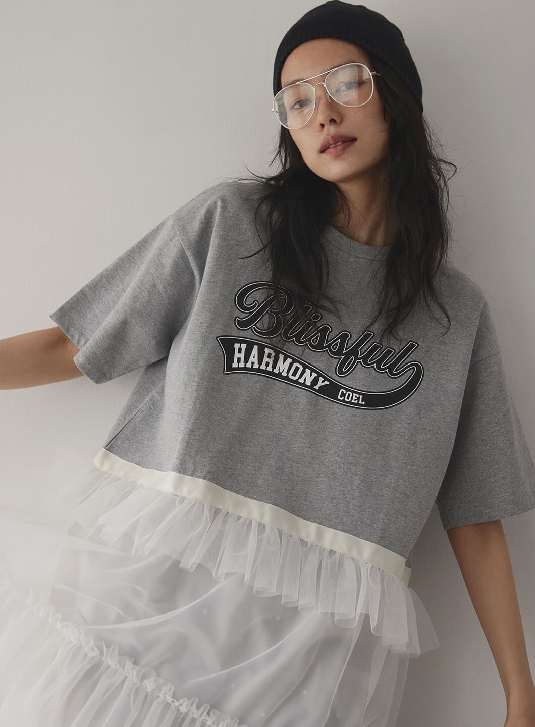 甘めのチュールとカジュアルなロゴTシャツをドッキングした一枚で主役なトップス。